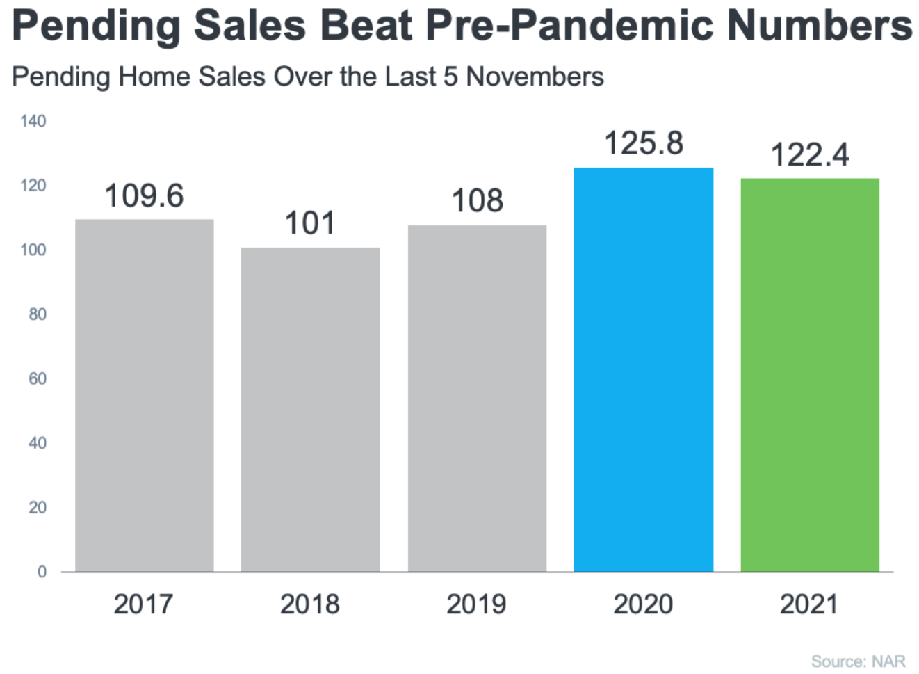 Also, at this time of year, only those purchasers who are serious about buying a home will be in the market. You and your loved ones won’t be inconvenienced by casual searchers. Freddie Mac addresses this in a recent blog: “The buyers who are willing to house hunt in a winter market, when there are fewer options, are typically more serious. Plus, year-end bonuses and overtime payouts give people more purchasing power.” And that theory is proving to be true right now based on the number of buyers who have put a home under contract to purchase. The National Association of Realtors (NAR) publishes a monthly Pending Home Sales Index which measures housing contract activity. It’s based on signed real estate contracts for existing single-family homes, condos, and co-ops. The latest index shows: “…housing demand continues to be high. . . . Homes placed on the market for sale go from ‘listed status’ to ‘under contract’ in approximately 18 days.” Comparing the index to previous Novembers, while it’s slightly below November 2020 (when sales were pushed to later in the year because of the pandemic), it’s well above the previous three years.